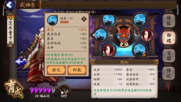 现在的主流茨木童子都是带破势的,毕竟一拳超人一拳6杀,破势的70%血量以上多加40%伤害是非常致命的,完美吻合一拳超人的特点,加上被动的伤害溢出,很容易造成大型aoe输出的效果 破势2速4攻6暴是常识,也就是说2号位置主属性速度,4号位置主属性攻击加成,6号位置主属性暴击概率,一套四星御魂+15能让茨木在40级前见神杀神见佛杀佛。 4星御魂将暴击概率配合其他御魂副属性直接堆上92%!几乎次次暴击